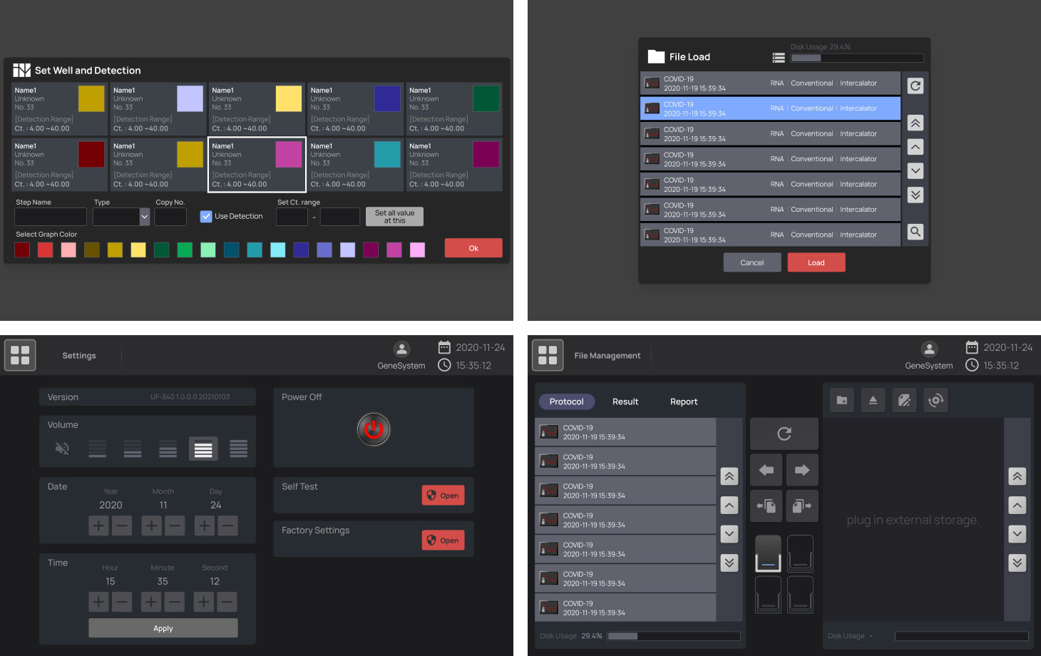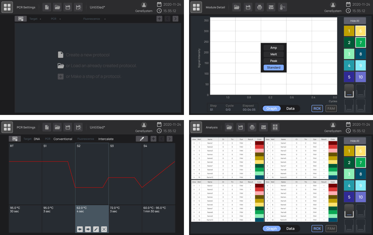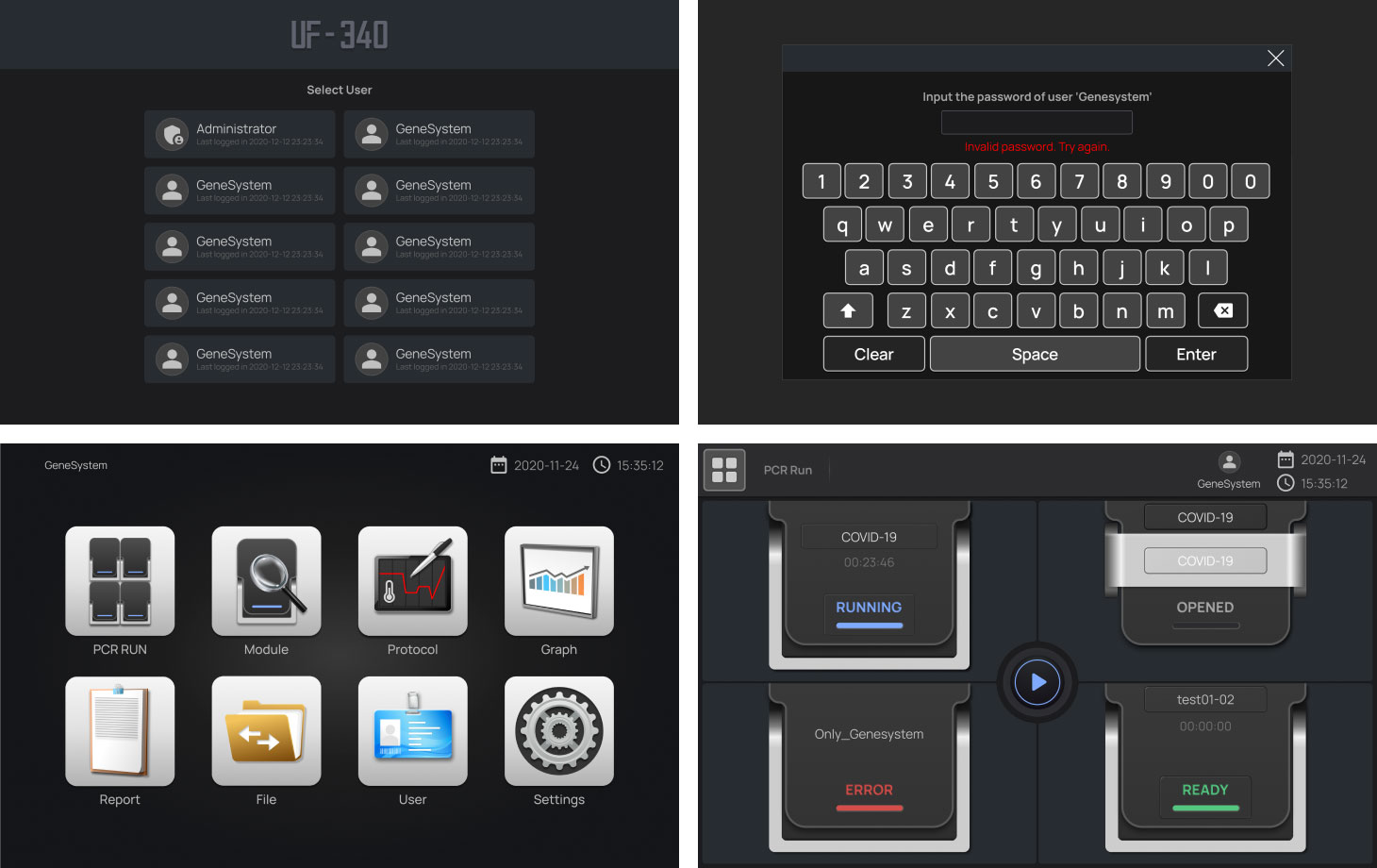 (주)진시스템 PCR 분석 기기인 UF-340의 UI/UX 작업. 별도의 교육 없이도 쉽게 이해할 수 있는 플로우로 구성하였으며, 직관적인 아이콘 이미지를 사용하였습니다. 수치 데이터는 가독성, 판독성을 중점으로 색구성을 하였습니다. 손가락 터치의 인터페이스를 사용하므로 각 인터렉션 요소의 크기와 상호간 비율에도 사용성을 고려하였습니다.
