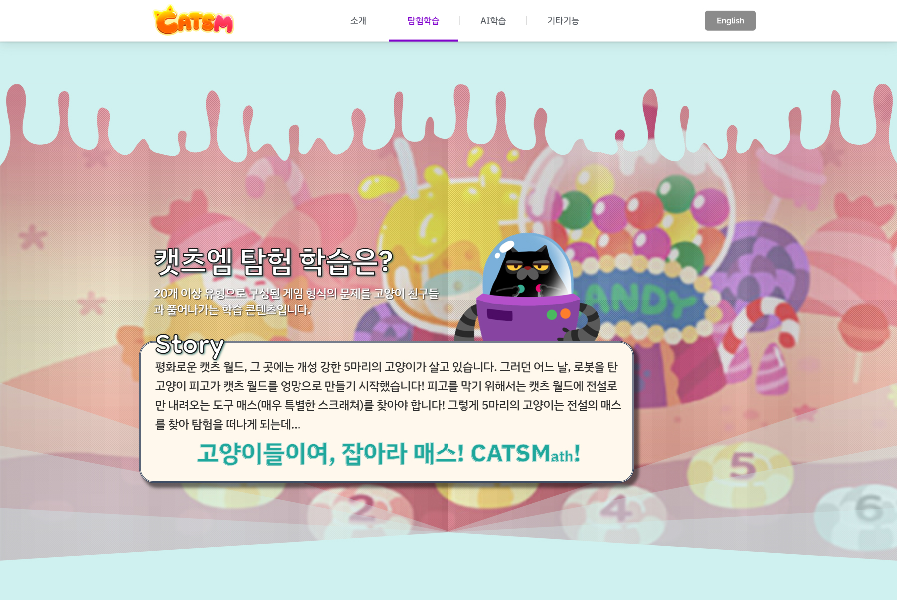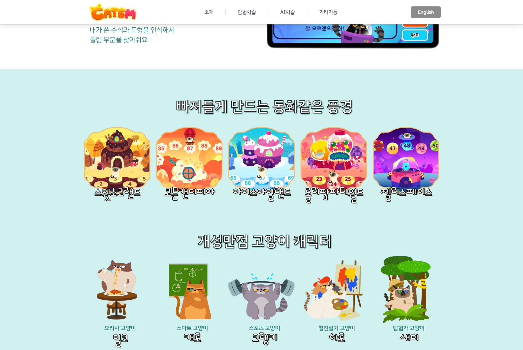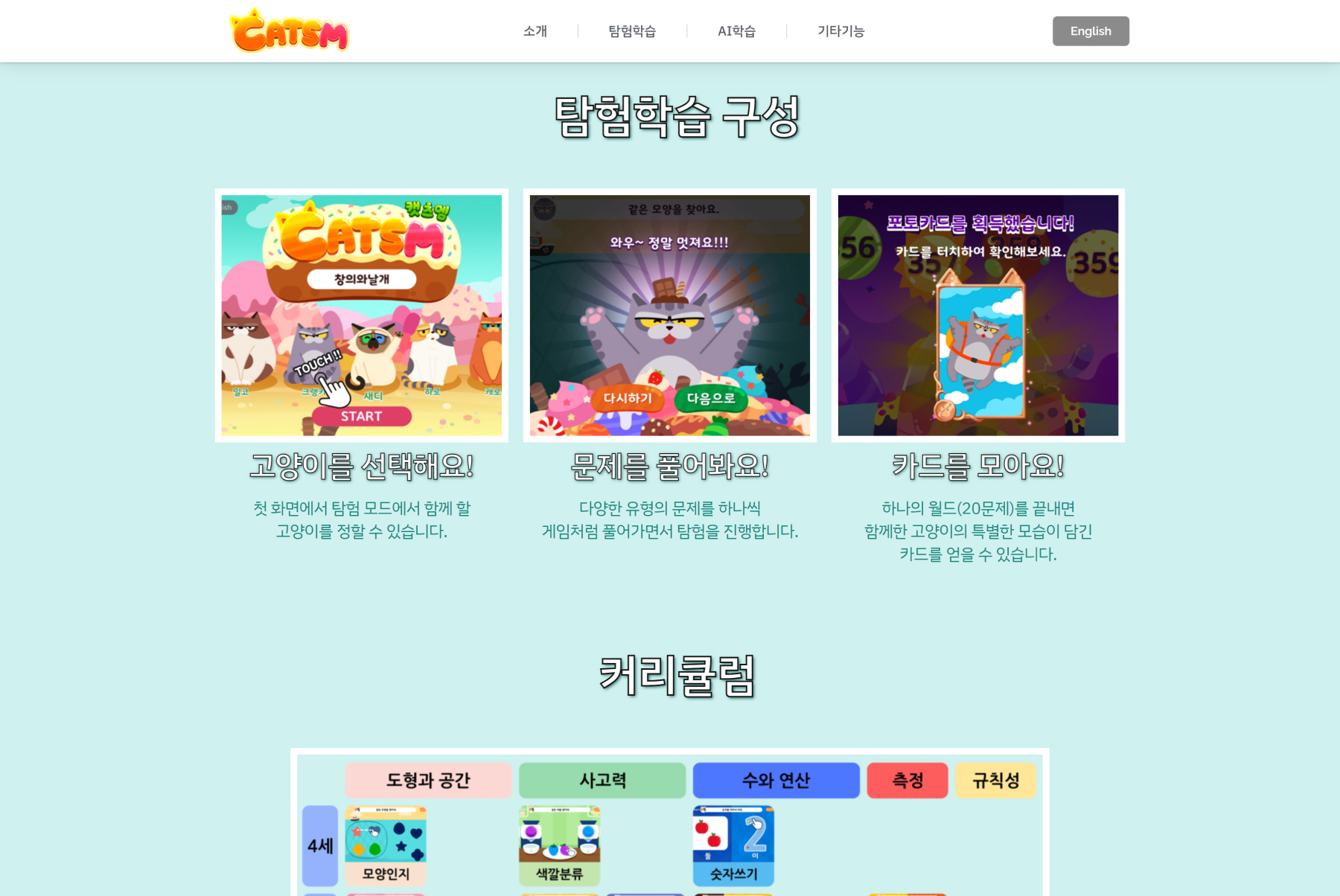 4-7세의 자녀를 둔 부모가 웹사이트의 주요 방문층입니다. <캣츠엠>앱에 등장하는 다양한 캐릭터와 배경의 시각적 느낌을 웹사이트에서 연속적으로 느낄 수 있도록 하였습니다. 각 섹션의 글자와 이미지에 애니메이션을 넣어, 귀여운 컨셉을 표현하였습니다. 앱의 목적과 두 줄기의 핵심 기능, 다양한 배경과 캐릭터의 소개, 구성, 커리큘럼 등 상세한 설명을 확인하고 나면, 앱을 설치하고 싶은 마음이 생길 것입니다.