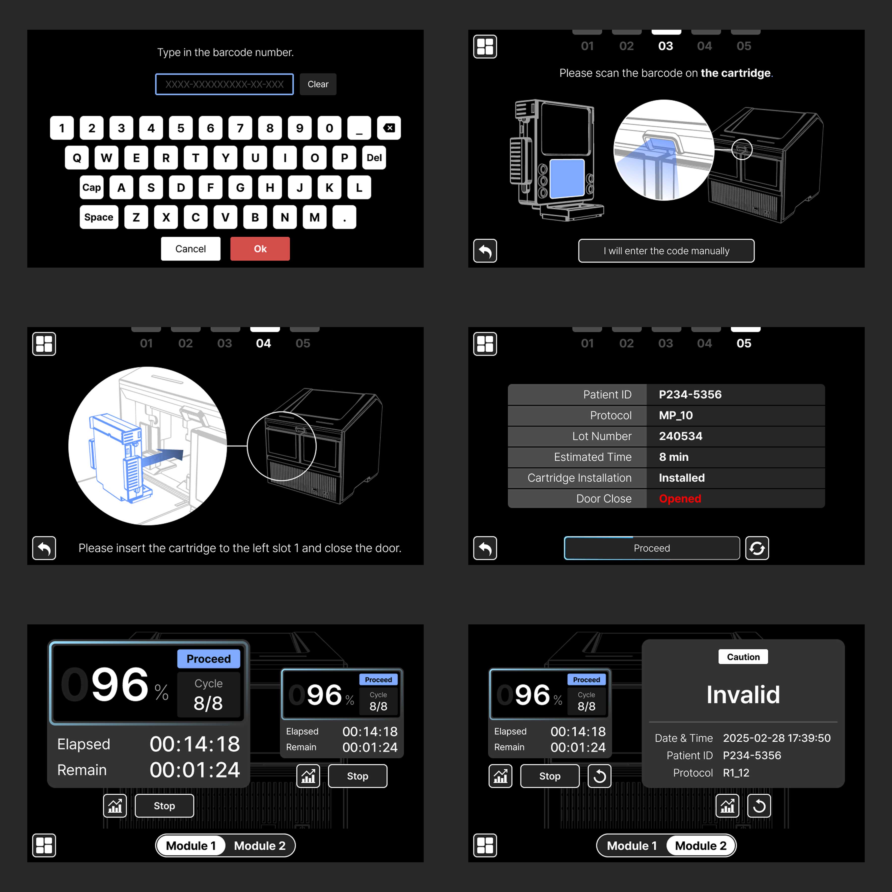 본 프로젝트는 GeneSystem의 바코드 스캐닝 기반 듀얼 PCR 분석 시스템 UF-400을 위한 임베디드 소프트웨어 GUI 및 UX 구축 작업으로, 정밀 의료·실험실 환경에서의 복잡한 분석 과정을 직관적으로 시각화하고 사용자 오류를 최소화하는 데 초점을 두었습니다. 다크 모드와 고대비 디자인으로 다양한 조명 조건에서도 시인성을 확보하고, 브랜드 컬러인 네온 시안과 일렉트릭 블루를 포인트로 활용해 정보의 위계를 명확히 했습니다. 위저드 방식의 단계별 워크플로우로 복잡한 하드웨어 조작을 쉽게 유도하고, 라인 일러스트와 애니메이션을 통해 물리적 조작 단계의 직관성을 강화했습니다. 실시간 분석 대시보드는 원형 진행 바와 남은 시간 표시로 상태를 즉각 인지할 수 있게 구성했으며, 그리드 기반의 모듈형 레이아웃으로 데이터 가독성을 높였습니다. 또한 터치스크린용 가상 키패드, 컬러 코딩된 시스템 피드백, 탭 구조의 관리 화면을 통해 효율적인 운영과 사용자 편의를 지원합니다. UF-400 UI/UX 디자인은 기존 실험 장비의 복잡함을 벗어나 첨단성과 인간 중심 경험을 결합해, 의료 현장의 업무 효율을 극대화한 솔루션입니다.