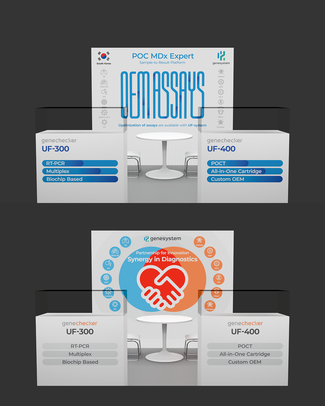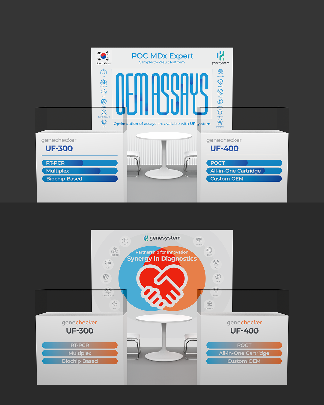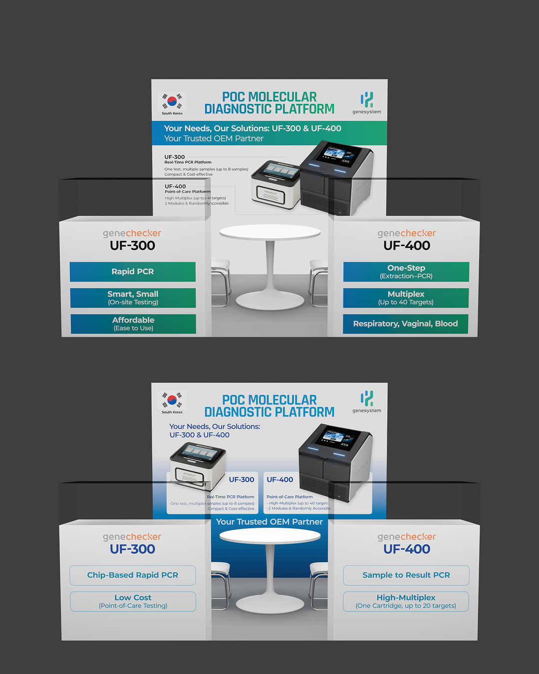주식회사 진시스템의 PCR 분석기기인 UF시리즈의 최신 기기를 전시, 소개하는 부스의 패널을 디자인 하였습니다. 컨셉은 진단기기 자체에 초점을 맞출 것인가, 아니면 구매자와의 협력 시너지에 맞출 것인가로 양분되었습니다. 이에 따라 형태와 색감을 다양화하였습니다. 클라이언트의 요구 사항에 맞춰 수정을 거듭하니 최종 시안까지 총 18개의 시안이 만들어졌습니다. 이 중 16개의 시안을 소개합니다.