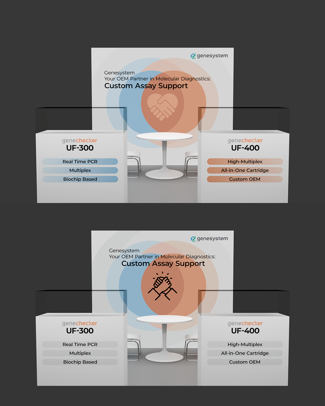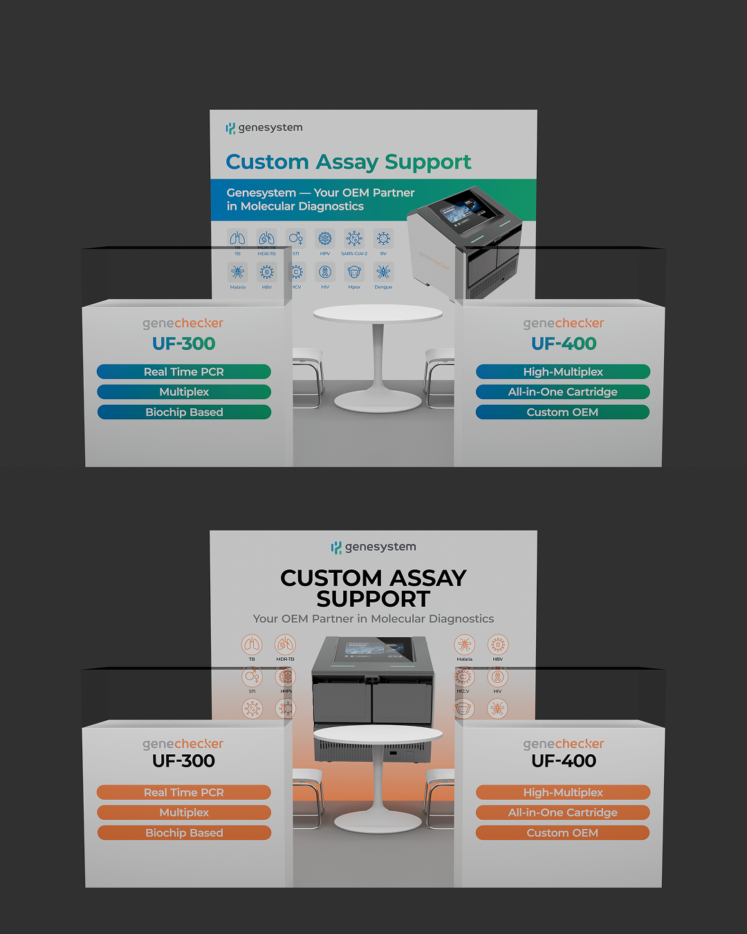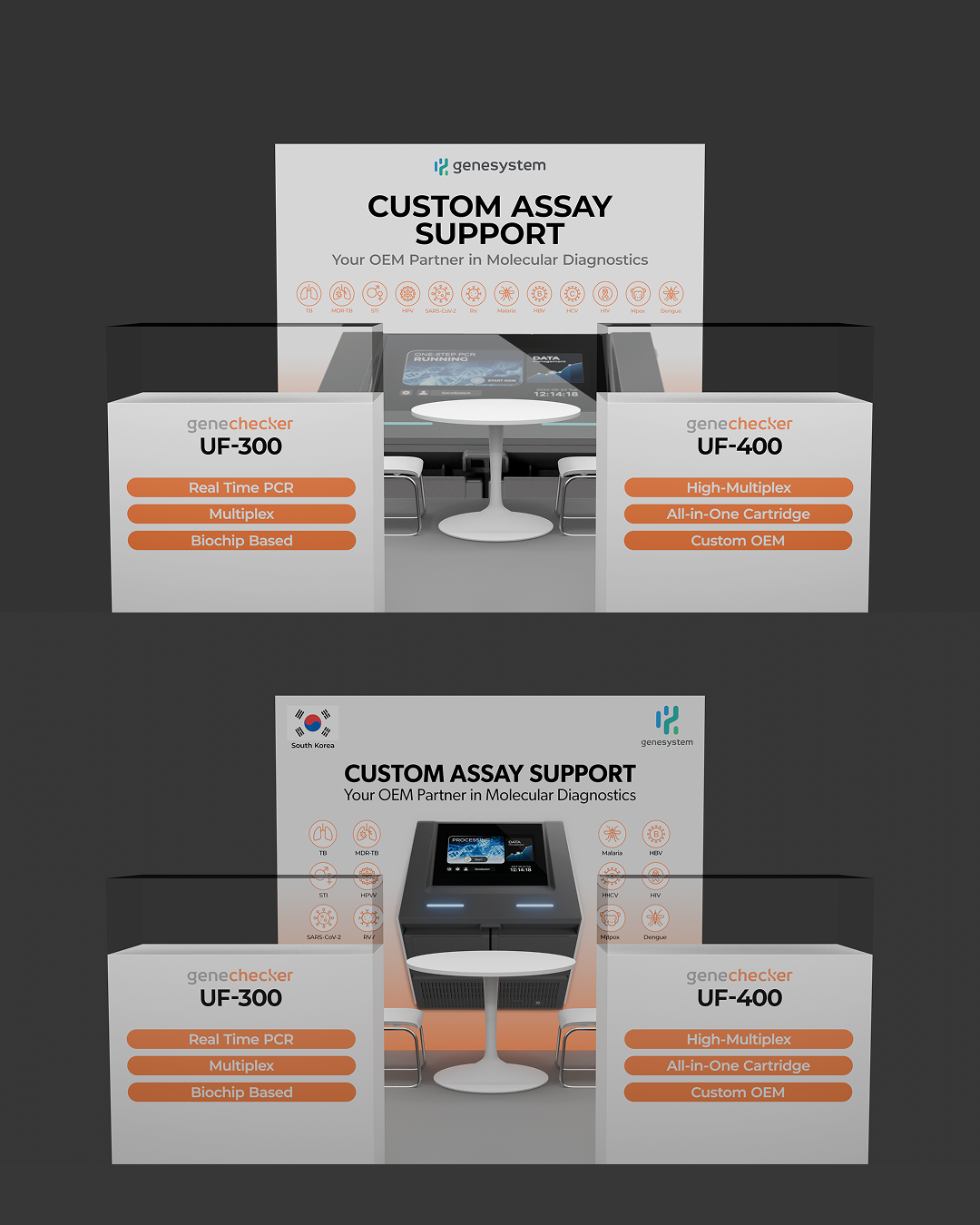 주식회사 진시스템의 PCR 분석기기인 UF시리즈의 최신 기기를 전시, 소개하는 부스의 패널을 디자인 하였습니다. 컨셉은 진단기기 자체에 초점을 맞출 것인가, 아니면 구매자와의 협력 시너지에 맞출 것인가로 양분되었습니다. 이에 따라 형태와 색감을 다양화하였습니다. 클라이언트의 요구 사항에 맞춰 수정을 거듭하니 최종 시안까지 총 18개의 시안이 만들어졌습니다. 이 중 16개의 시안을 소개합니다.