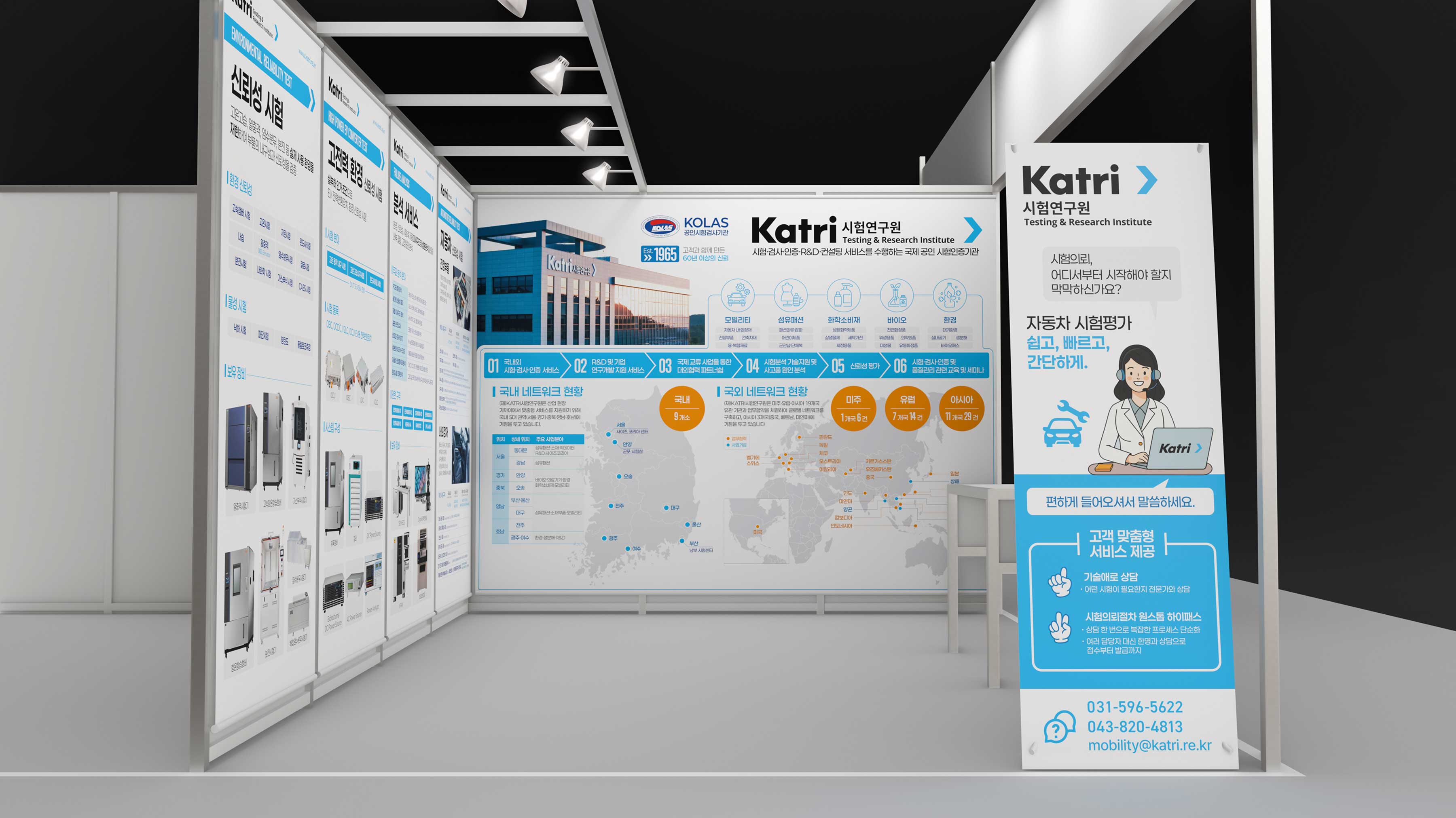 KATRI 시험연구원은 1965년부터 현재까지 60년 이상 고객과 함께 검사, 인증, 컨설팅 분야에서 신뢰를 얻어 온 기관입니다. 2025년 국제 모빌리티 산업전(KOAA-GTT)에 홍보 부스를 두어 모빌리티 분야에 중점을 둔 홍보를 진행하였습니다. 부스의 전체적인 색감은 KATRI 시험연구원의 CI 색상을 활용, 응용하였습니다. 클라이언트가 제공해준 사진의 해상도가 인쇄용으로 사용하기에는 다소 낮았는데, 직접 촬영을 했으면 좋겠지만, 시간과 비용적 측면에서 불가능하여 AI 기술인 이미지 업스케일링을 사용하였습니다.