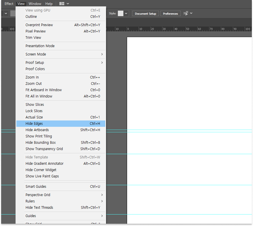 일러스트레이터에서 가이드라인(Guide Line)을 선택툴로 선택해서 이동하고 싶을 때, 선택하면 가이드라인이 사라지는 현상이 있습니다. 보통 이러한 현상을 겪어 해결방법을 찾으시는 분들이 있어서 해결방법을 알려드리고자 합니다. 주로 단축키를 사용하다가 다른 단축키를 눌러서 일어나는 일입니다.